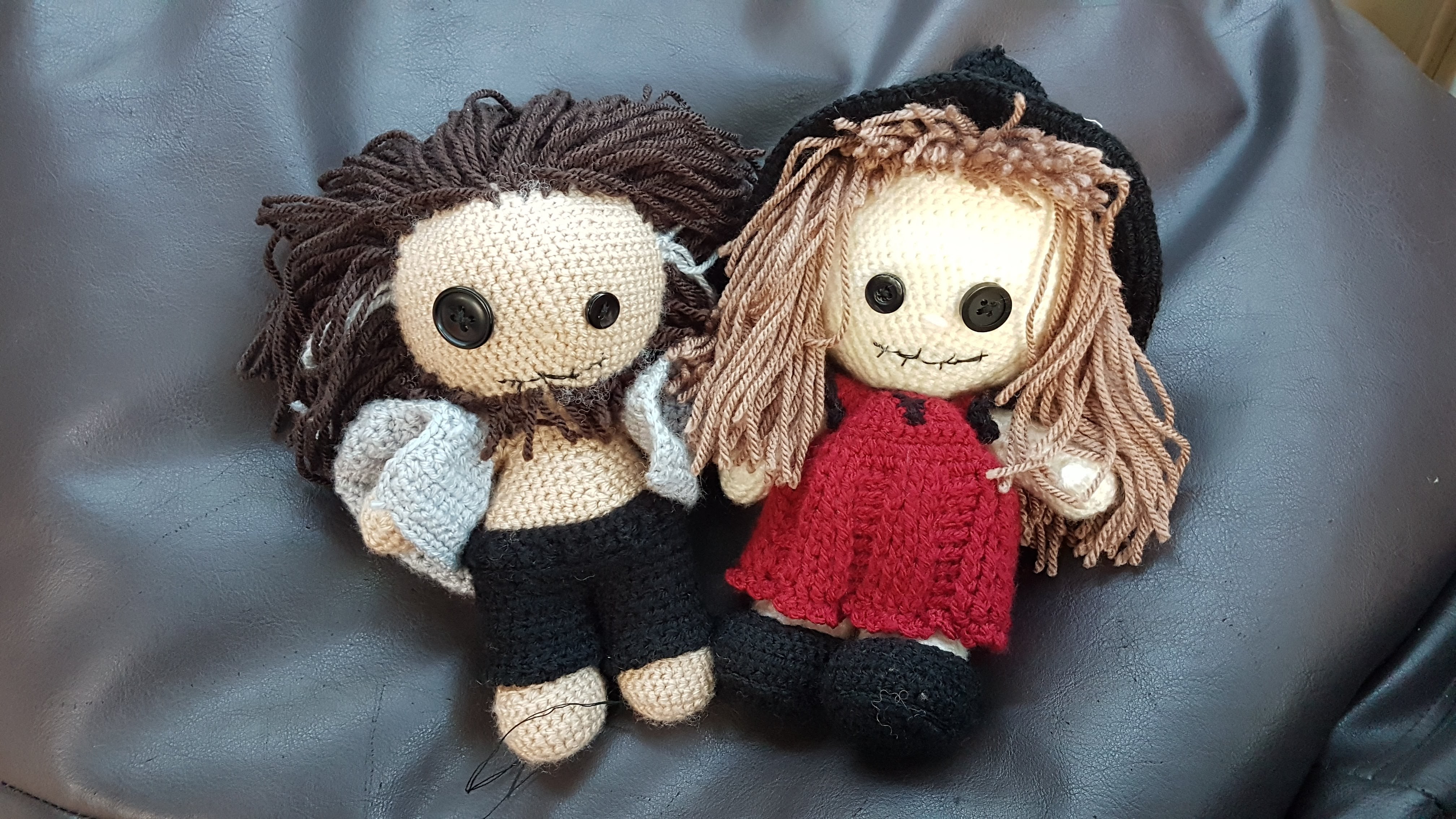 I finished the custom dolls this week and handed them over – they are quirky portraits of a couple who live some distance apart. My brief was to make the girl doll ‘witchy’ which was fun! The basic pattern is the Weebee doll (available on Ravelry) and my customer is a member of an RPG group whose DM had already commissioned character dolls for me (his was a Cyborg!). I loved doing these – adding the little details like the beard, the temple greys and the girl doll’s short fringe made them really personal.