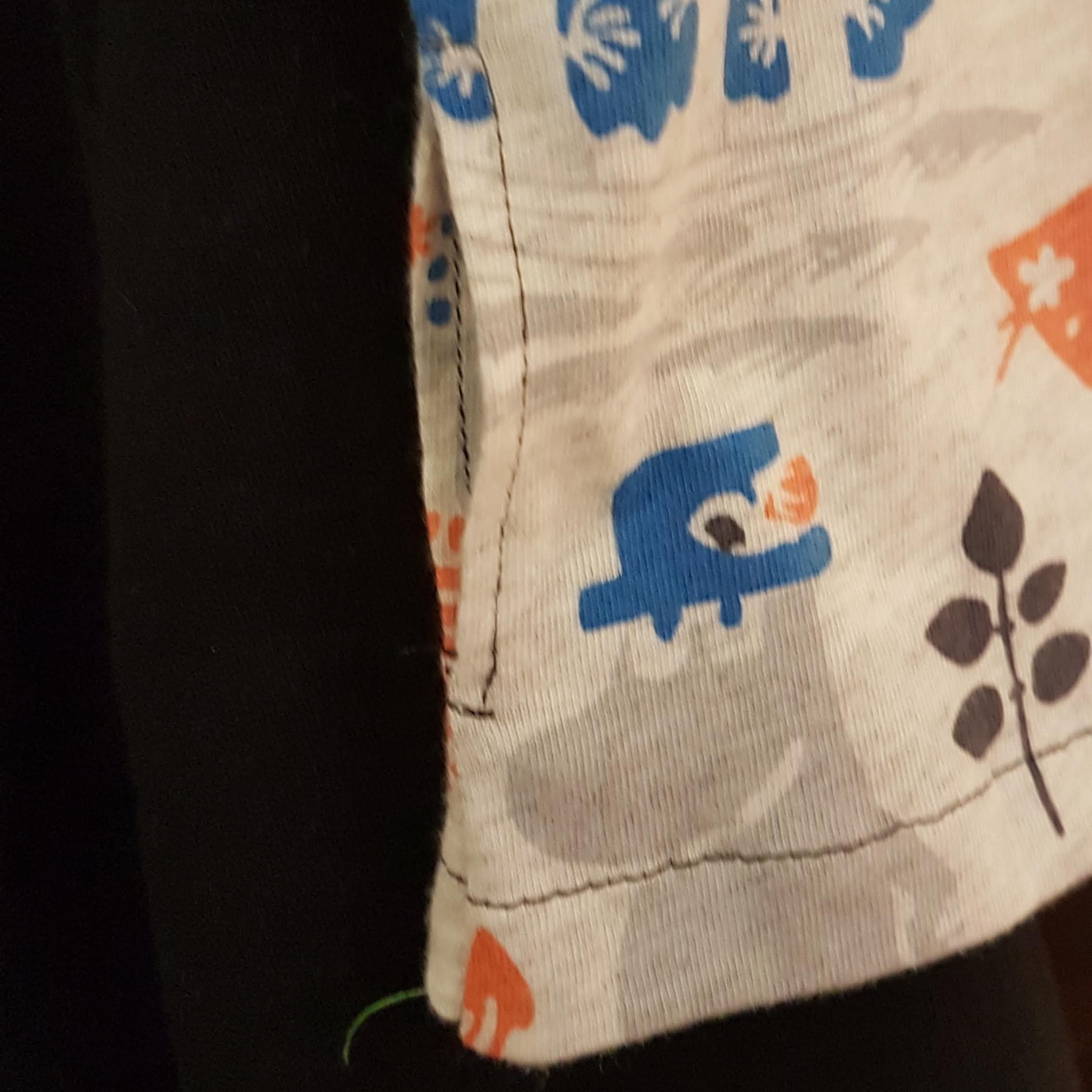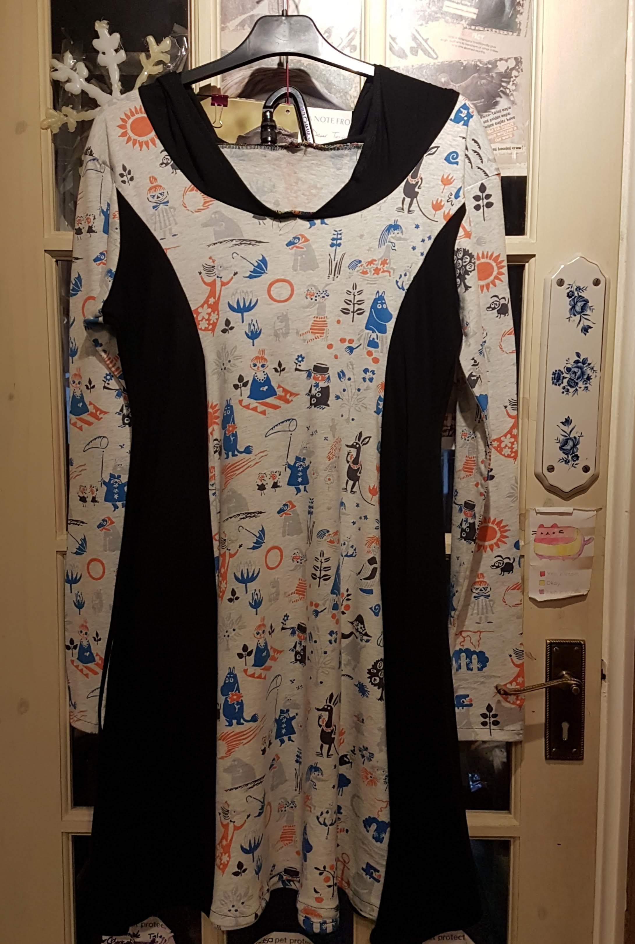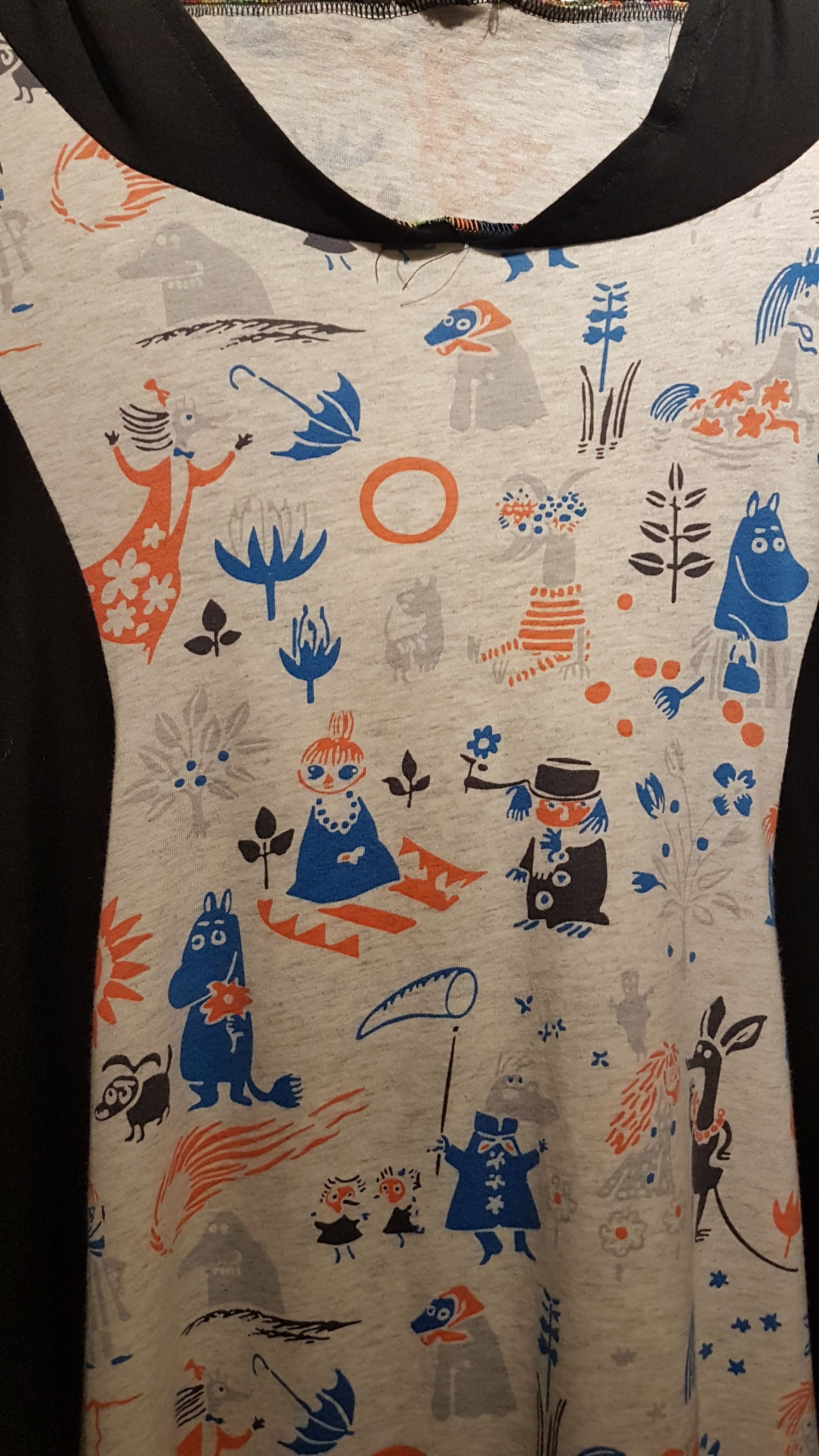 I’ve had a lovely Moomin print jersey in my stash for a while – a bargain from Ali Express – and I was saving it for a pattern that would show it off. This Double Down Dress from Little Ragamuffin was it. I had enough Moomin fabric for the front and back centre panels, the sleeves and the pockets – with some black jersey for side panels and the hood, it was perfect.