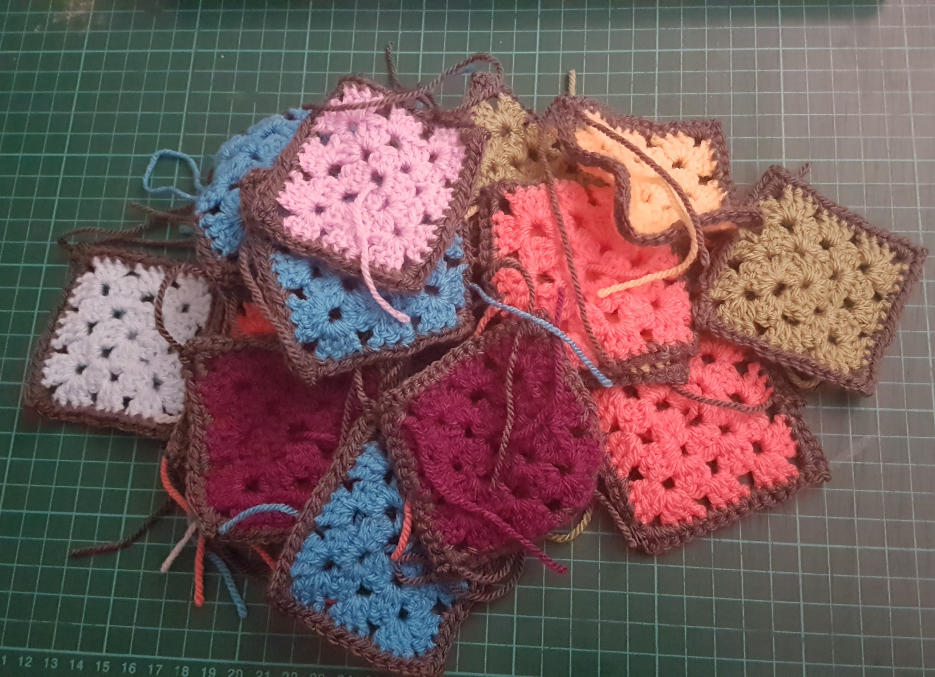 Progress on the sock has slowed again as I was only on the tube two days this week, but I have started putting together squares for a blanket. I wanted a nine-patch effect, and am edging the squares and each block with charcoal grey. I like the stained glass type effect.