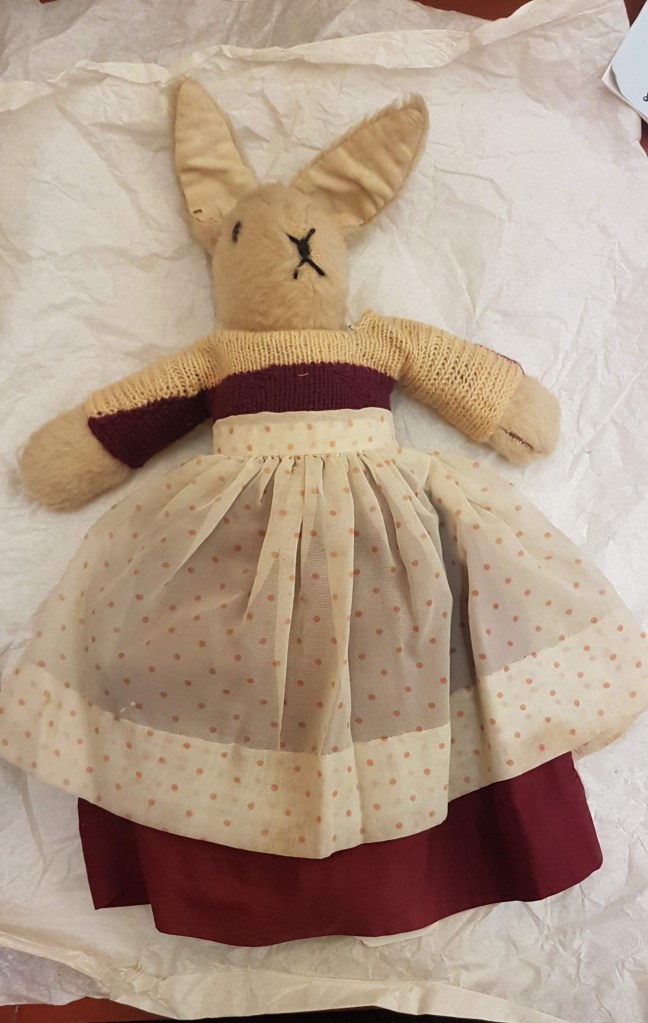 Our teddy collection ranged from the tiny, pocket-sized bears to much larger Steiff growly bears, nearly half the size of the six year olds who ‘demonstrate’ them in school sessions. Some were handmade, some were beautifully dressed in handmade clothes. There were also rabbits, cats, dogs and the box of more than 100 mice I have mentioned in a previous post.