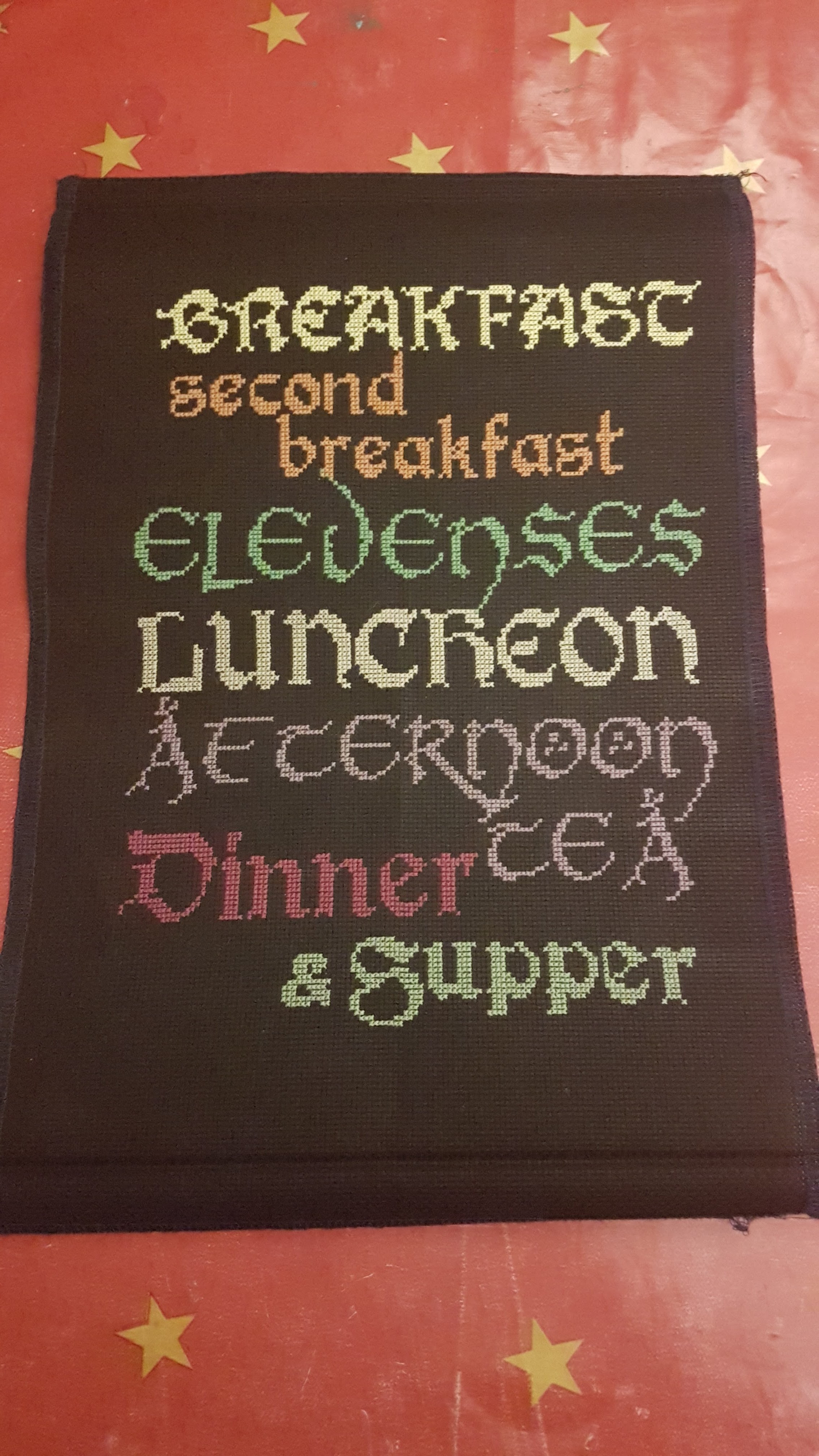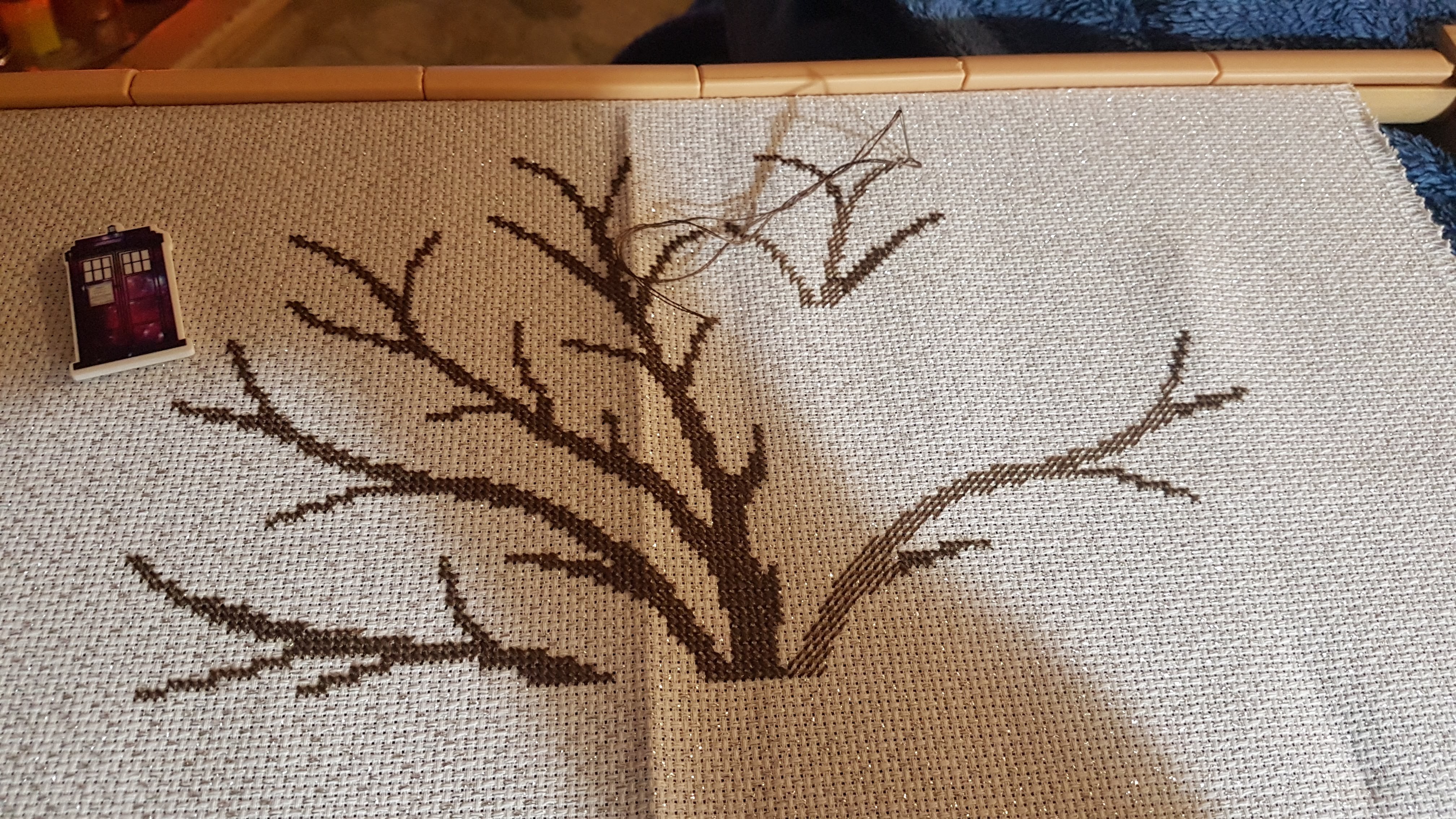I finished the ‘Second Breakfast’ cross stitch, and have started the temperature tree that I mentioned last week. So far it’s all tree and no temperature, and I have used almost a whole skein of DMC 839. I chose to use sparkly white aida fabric for it for no particular reason other than that I had some and I like it!