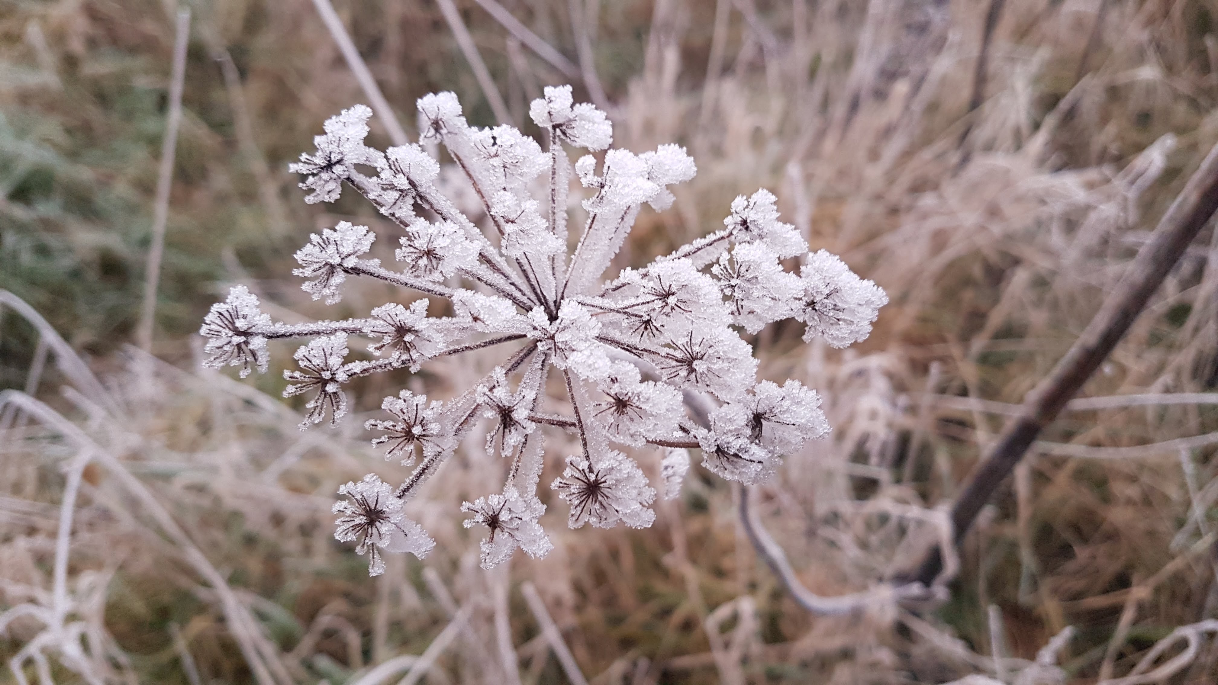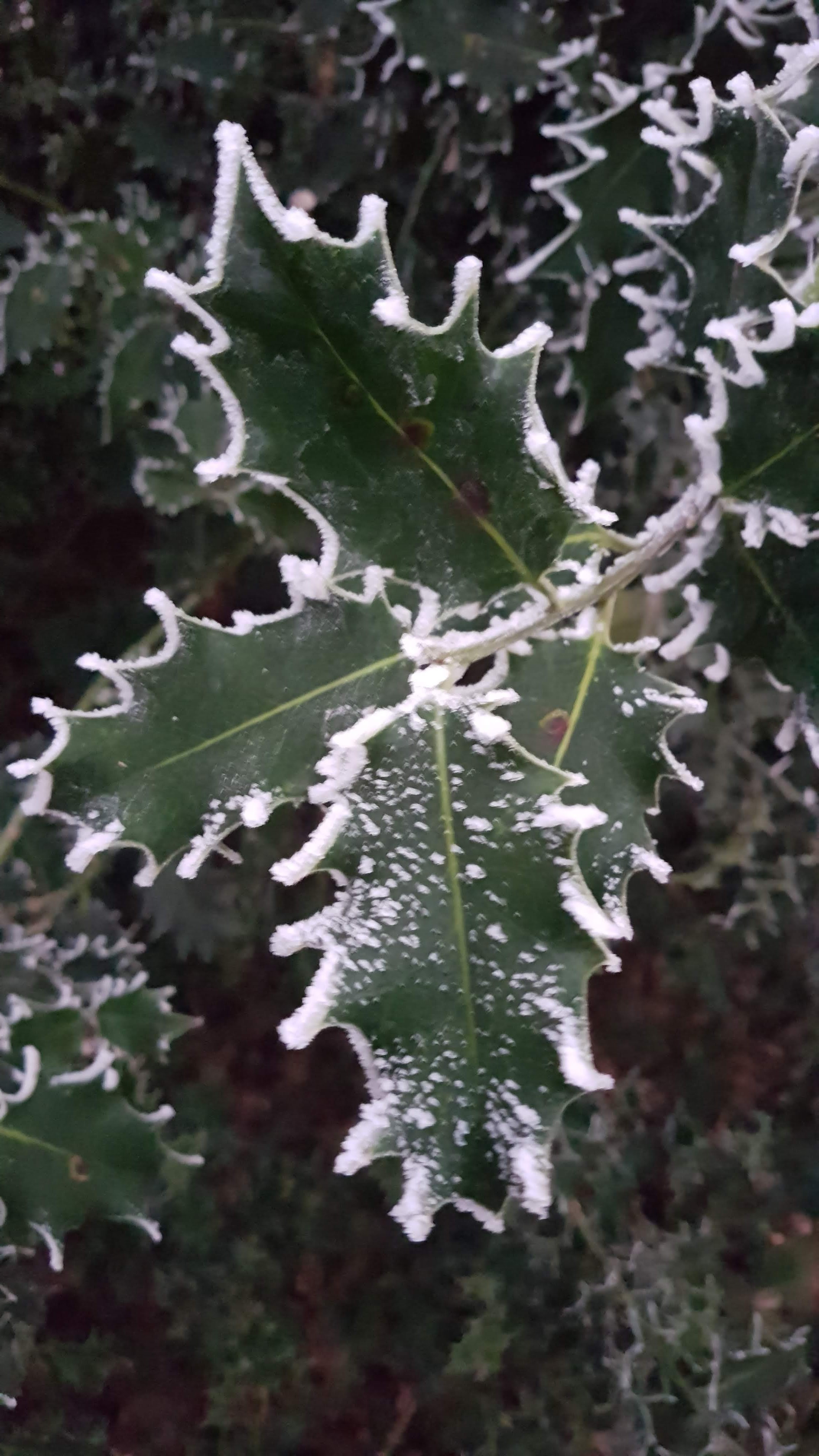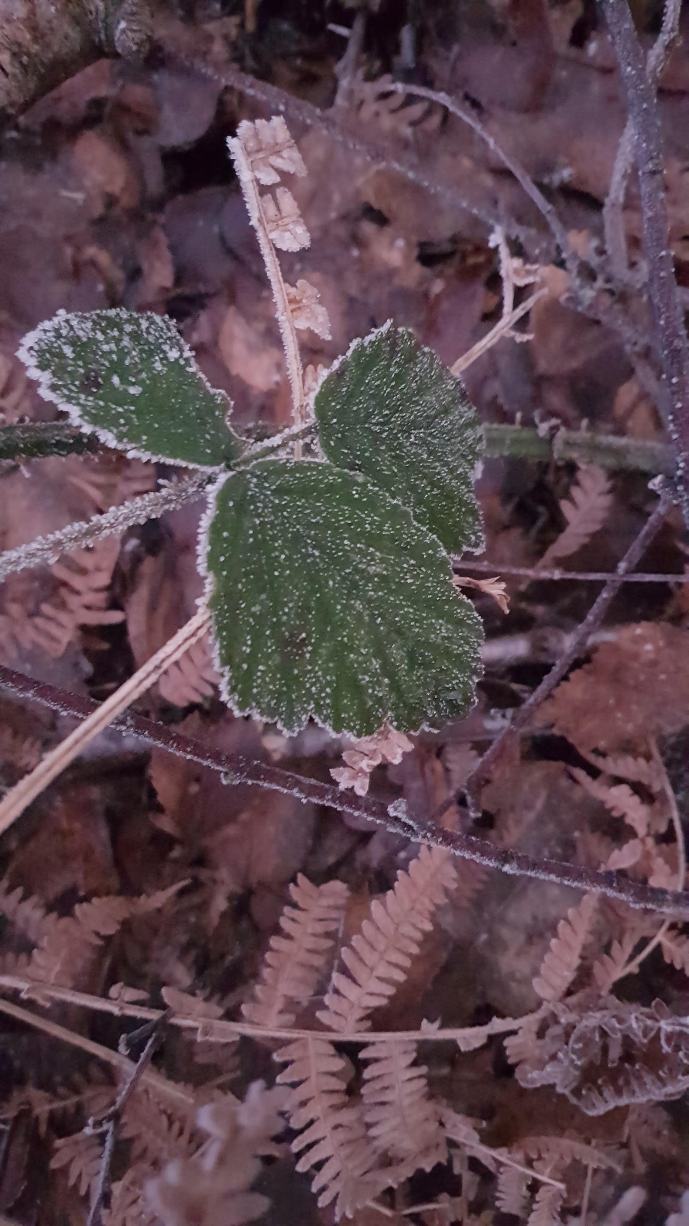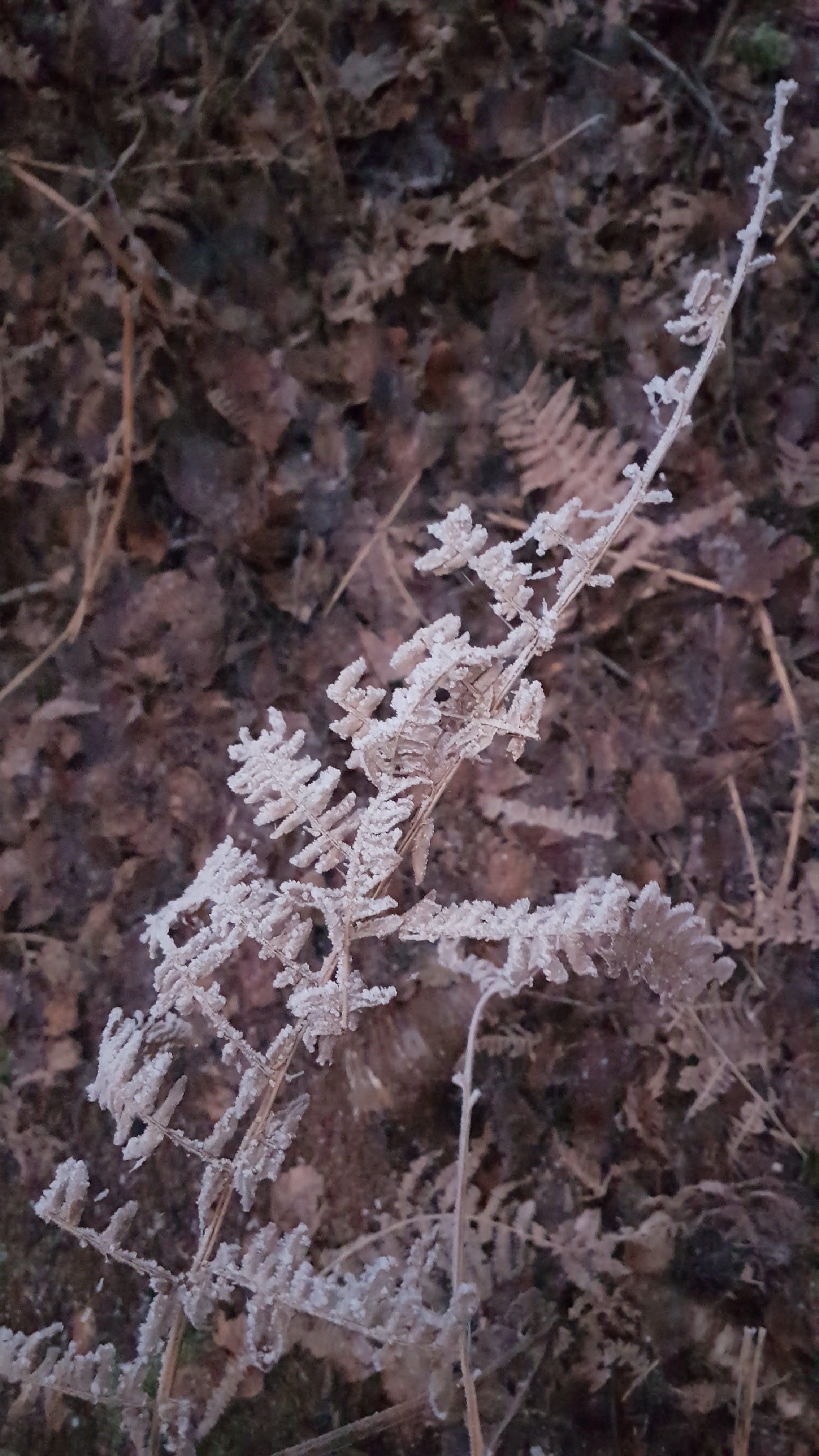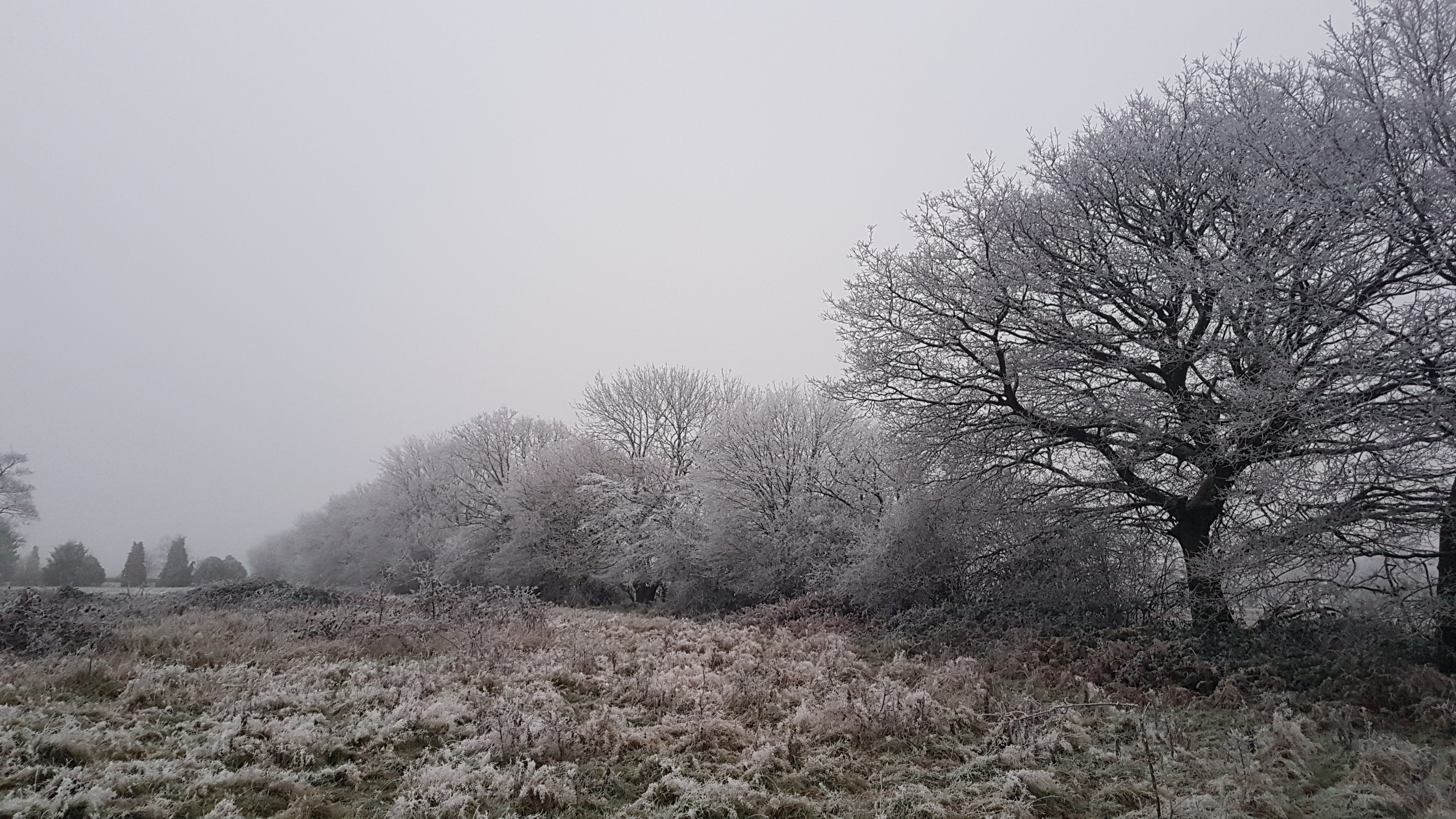The fields are breathtaking this morning: it’s still below zero out there, and the trees are rimed with ice. It was still dark when we went out, the freezing fog was still hanging around, and the white trees loomed in front of us like bloody great ghosty things. A phone camera doesn’t do it justice, as you can’t capture the atmosphere, but these are from our walk this morning: