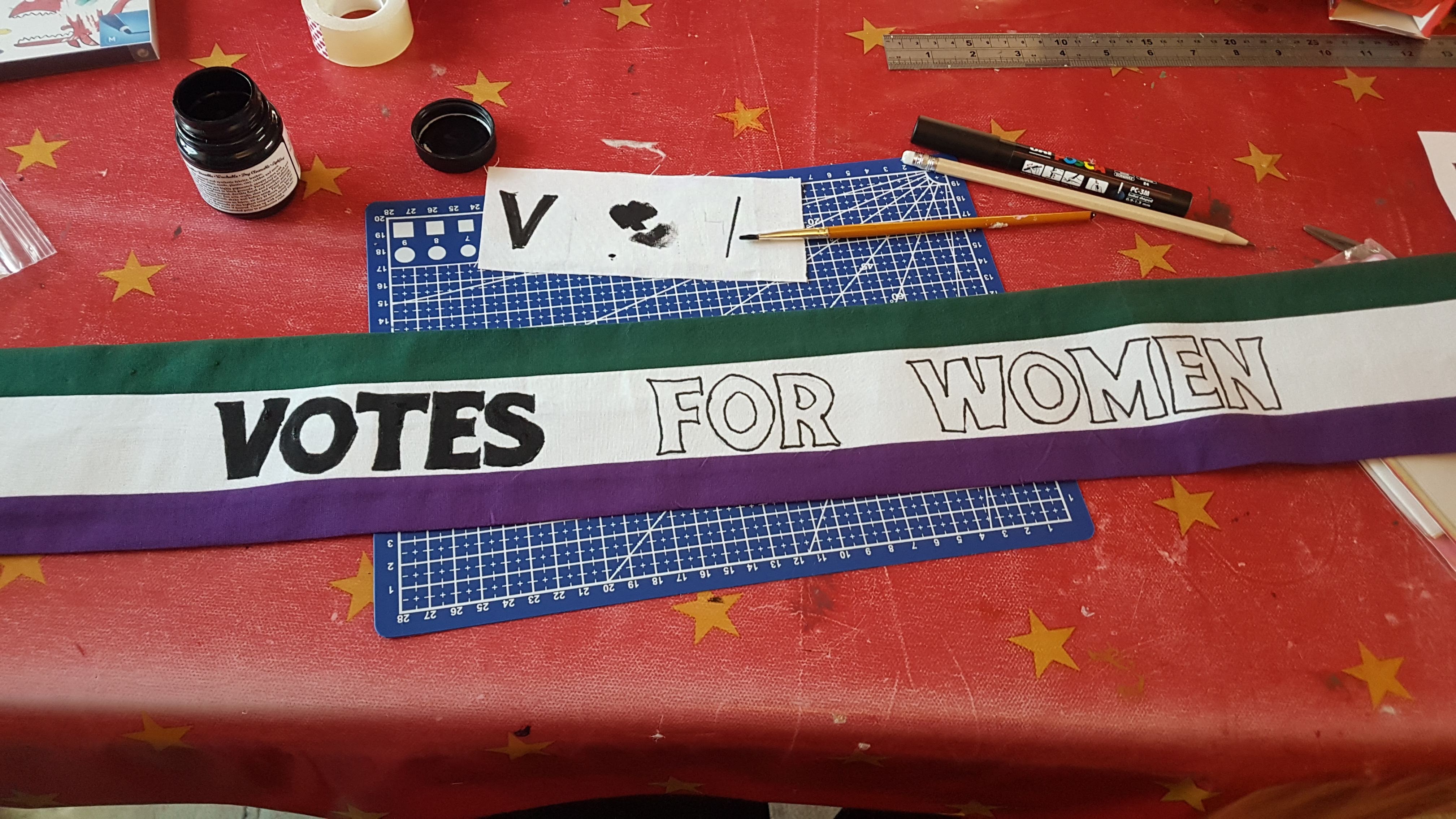 I made a couple of ‘Votes for Women’ sashes for Irish sister’s living history interpretation company, using this very clear tutorial by Susannah French.
