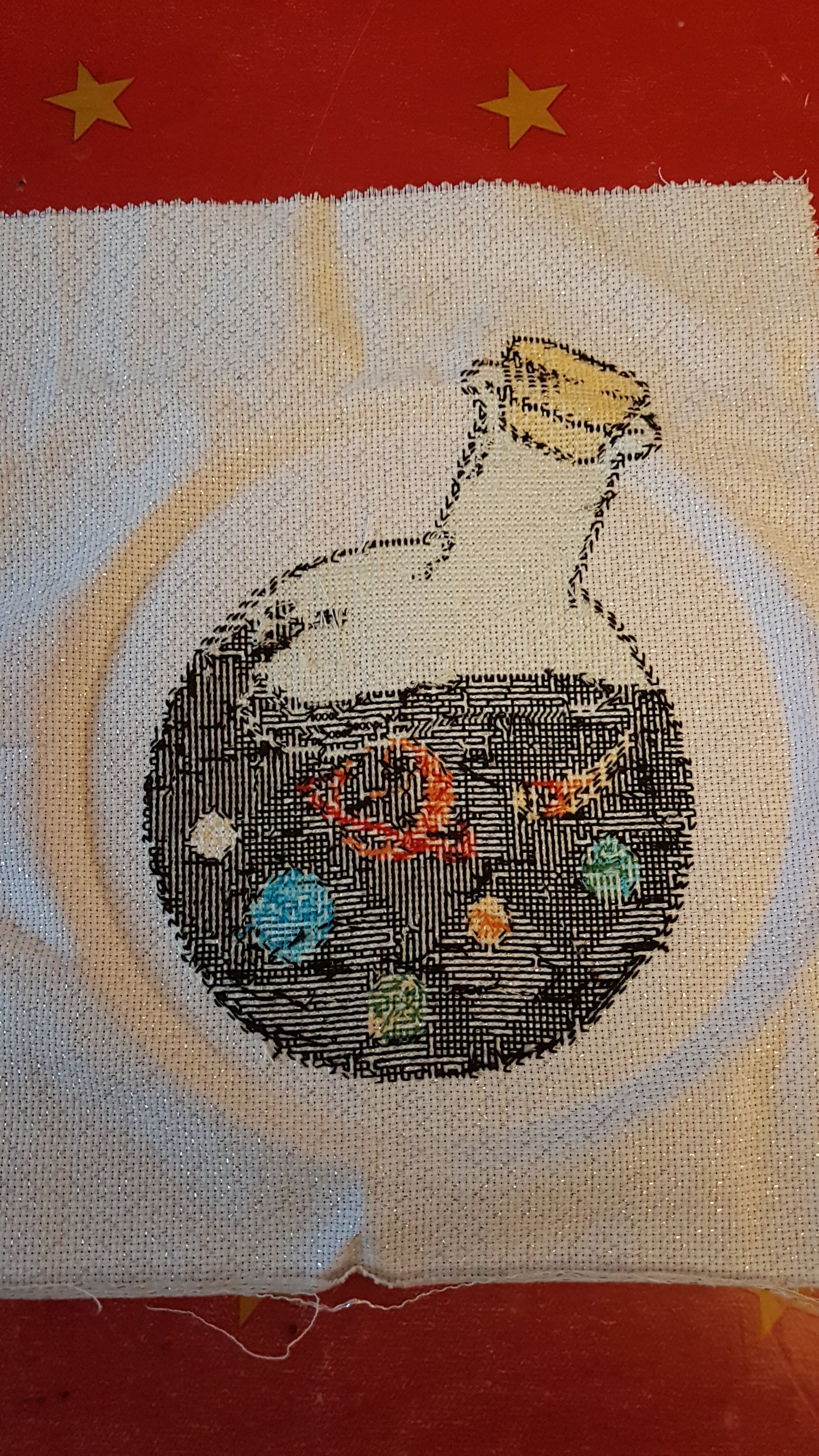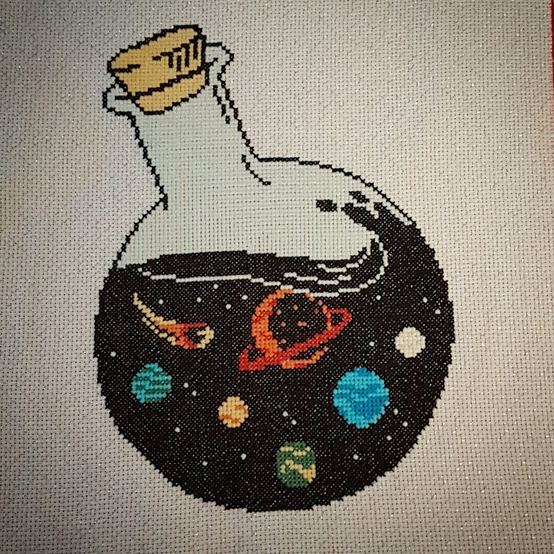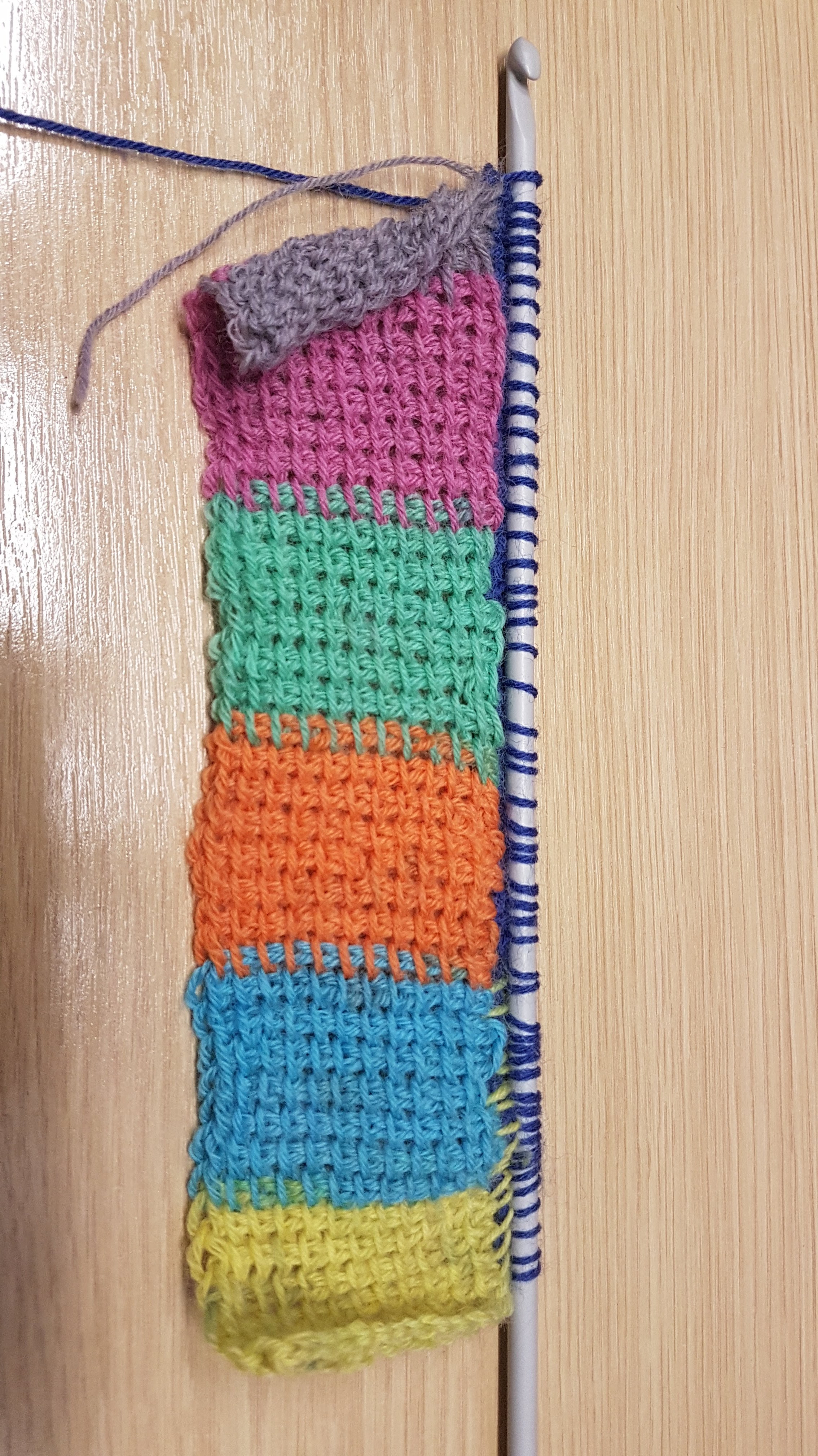 I finished the ‘Galaxy in a Bottle’ cross stitch and been working on a couple of smaller pieces as part of the year of handmade gifts – one of them I designed myself, the other is an Etsy pattern, but both are housewarming gifts that I’ll share at some point. The Tunisian sock is coming on slowly on my journeys to work: I had to frog about 6cm of the leg when I realised I should have turned it after the cuff so it folded the right way. The self-striping yarn is Paintbox Sock Yarn in the rainbow colourway.