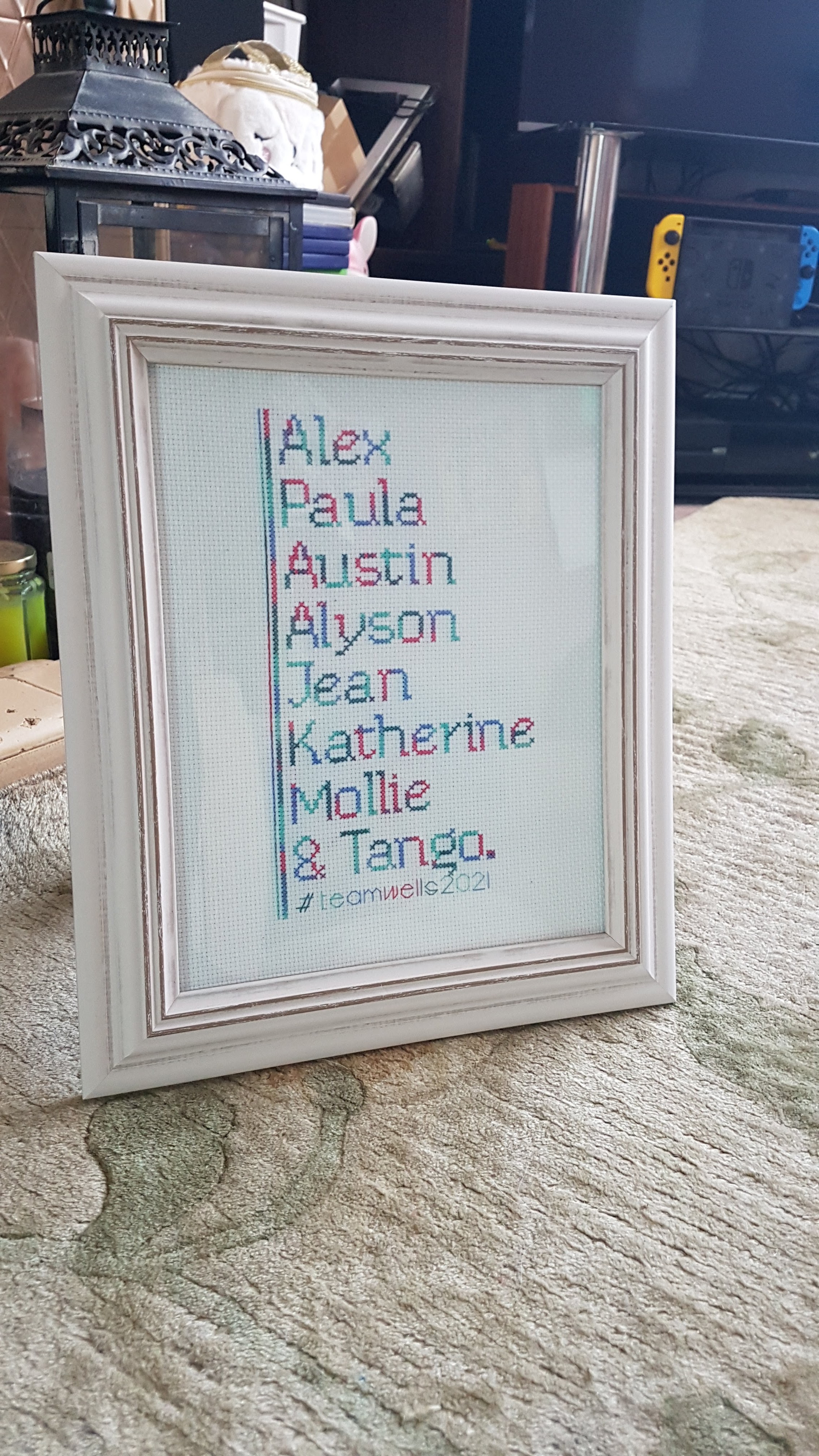 This week I have handed over a handmade gift to a friend who’s just moved house, combining her family with her mother-in-law and taking on a renovation project. 3 adults, 2 kids and 3 hounds! I designed this one, using an alphabet from Lord Libidan and DMC Coloris thread. I’m working on two other gifts as well, which should be finished and sent off soon!