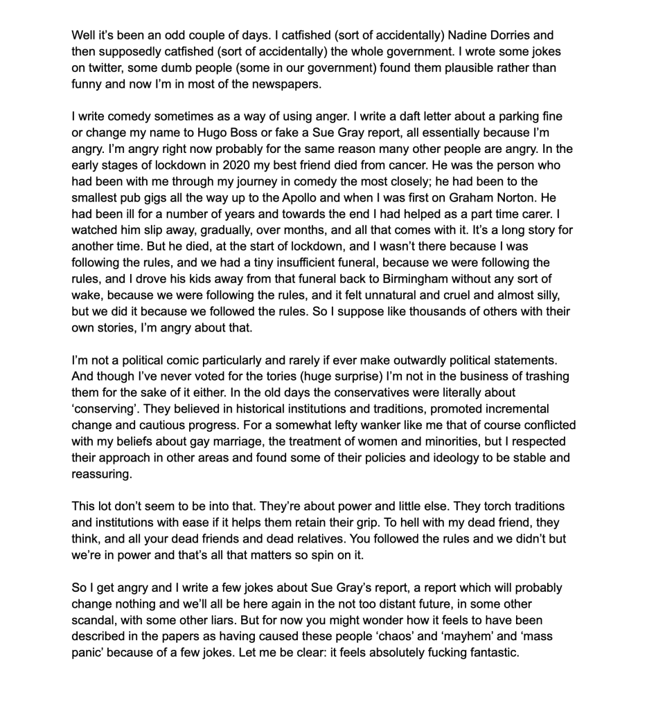 Joe Lycett ‘leaked’ a spoof version of Sue Gray’s report into so-called ‘Partygate’ and the repeated alleged breaking of the Covid rules by the government. In a classic case of ‘first line only’ information gathering this apparently sent Westminster staffers into a tailspin, with panic dialling to MPs and frantic headless chickening. The email address ‘ItsAllSueGravyBaby@aol.com’ was not enough to let our leaders know this wasn’t an actual leak… Joe followed this up with a wonderful, emotional open letter about why he’s so angry.
