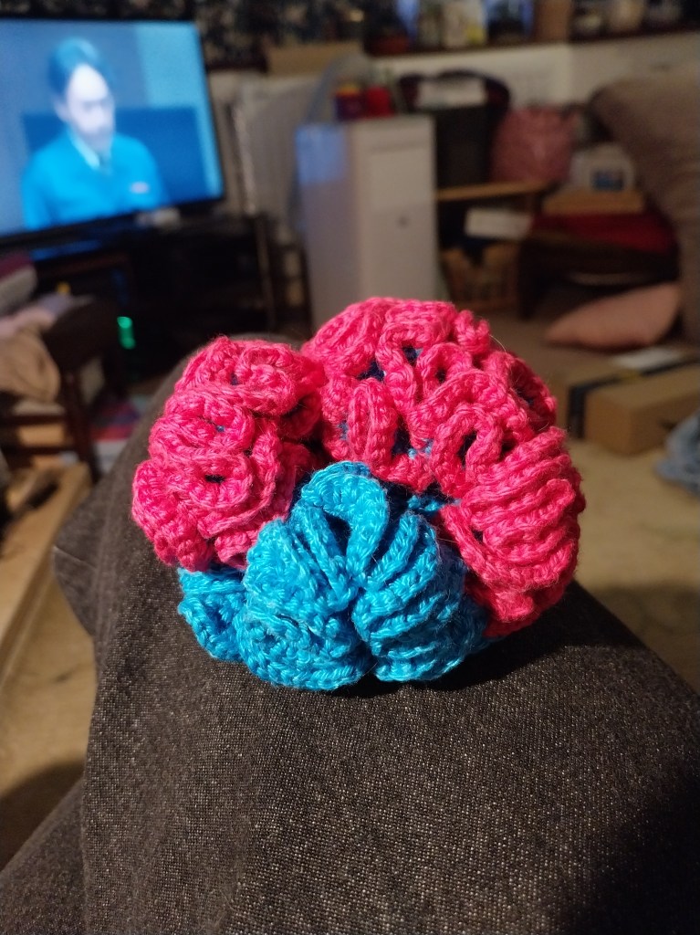 In 1997 Dr Daina Taimina, a professor at Cornell University, discovered that the best way for humans to make models which demonstrate this geometry is with crochet – just by modifying the basic crochet code you can create these weird and wonderful shapes. She wrote a book about it, explaining the history and development of non-Euclidean geometry and its applications to art, music, computer science and all sorts of other clever things. It’s the only maths book I have ever read for fun, thanks to cousin Sal who needed a model made for demonstrating the concept of hyperbolic space to teenagers.