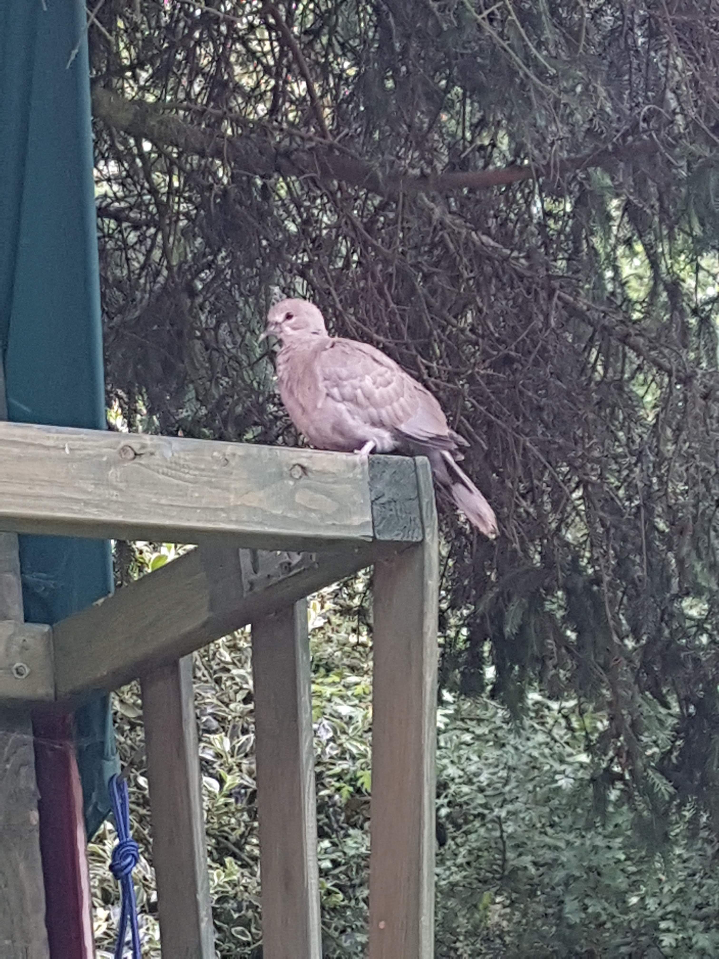 He wasn’t a fledgeling as all his beautiful feathers were in. We have experience with fledgelings, as we once rescued a baby woodpigeon who’d fallen out of the nest and kept him in a box on the trampoline for a couple of weeks while his anxious parents flew down and fed him. I don’t know whether he was a single chick who was just too fat for them to get back off the ground or if he just went too early. Eventually the rest of his feathers grew in and he fledged properly over a couple of days and headed off. We also used to have a collared dove pair who nested in the Christmas tree where the treehouse was and we always enjoyed watching their nestlings hop around on the railings. We’re lucky enough to have a lot of mature trees around the garden, and usually have robins, blue tits (who treat the trampoline net as a climbing frame), blackbird, woodpigeon and magpie families raising chicks every year. There’s a fierce wren who chased Ziggy off, much to his surprise and embarrasment, and a poser of a bullfinch who sits on a tree stump and shows off. The odd sparrowhawk has been known to rest on the edge of the sunroom roof, and the roof pigeons like to sit on the glass roof and wind up the cats.