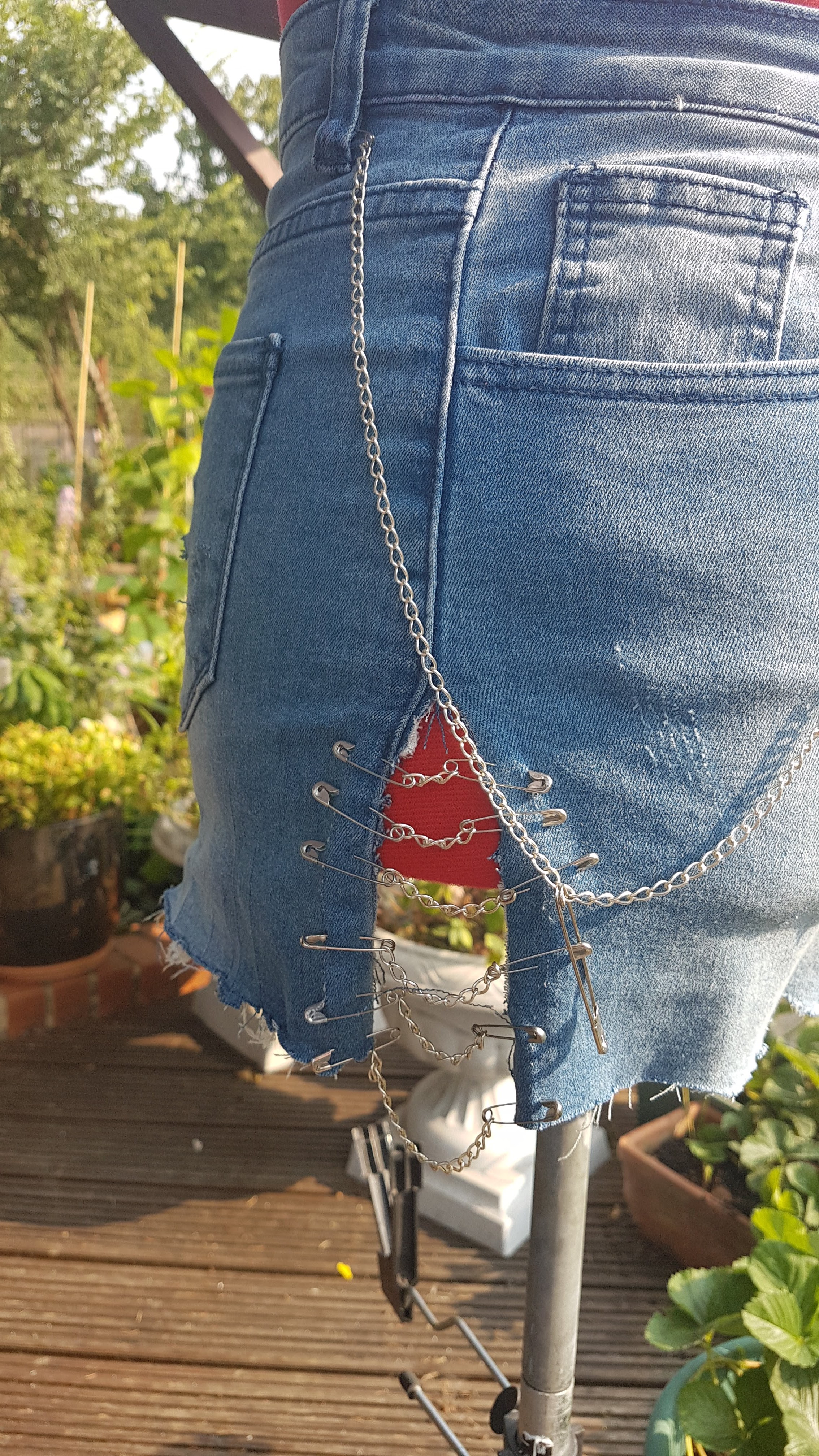 As the top of the garden is a bank, I had to dig out the hole for it myself – 10′ x 6′, and nearly 3′ deep at the back. Then we laid broken paving slabs, tarpaulin and plastic pallets, gave it a new plywood floor and I painted the inside white and the outside with wood protector. I added a laminate floor made of offcuts from our kitchen and from Freecycle again, and for my birthday a year later my beloved bought me some decking and a trellis so I could sit outside the shed and make things in the garden. It has a solar panel so I can power LED lights, and plug my phone in when I am pottering about up there.