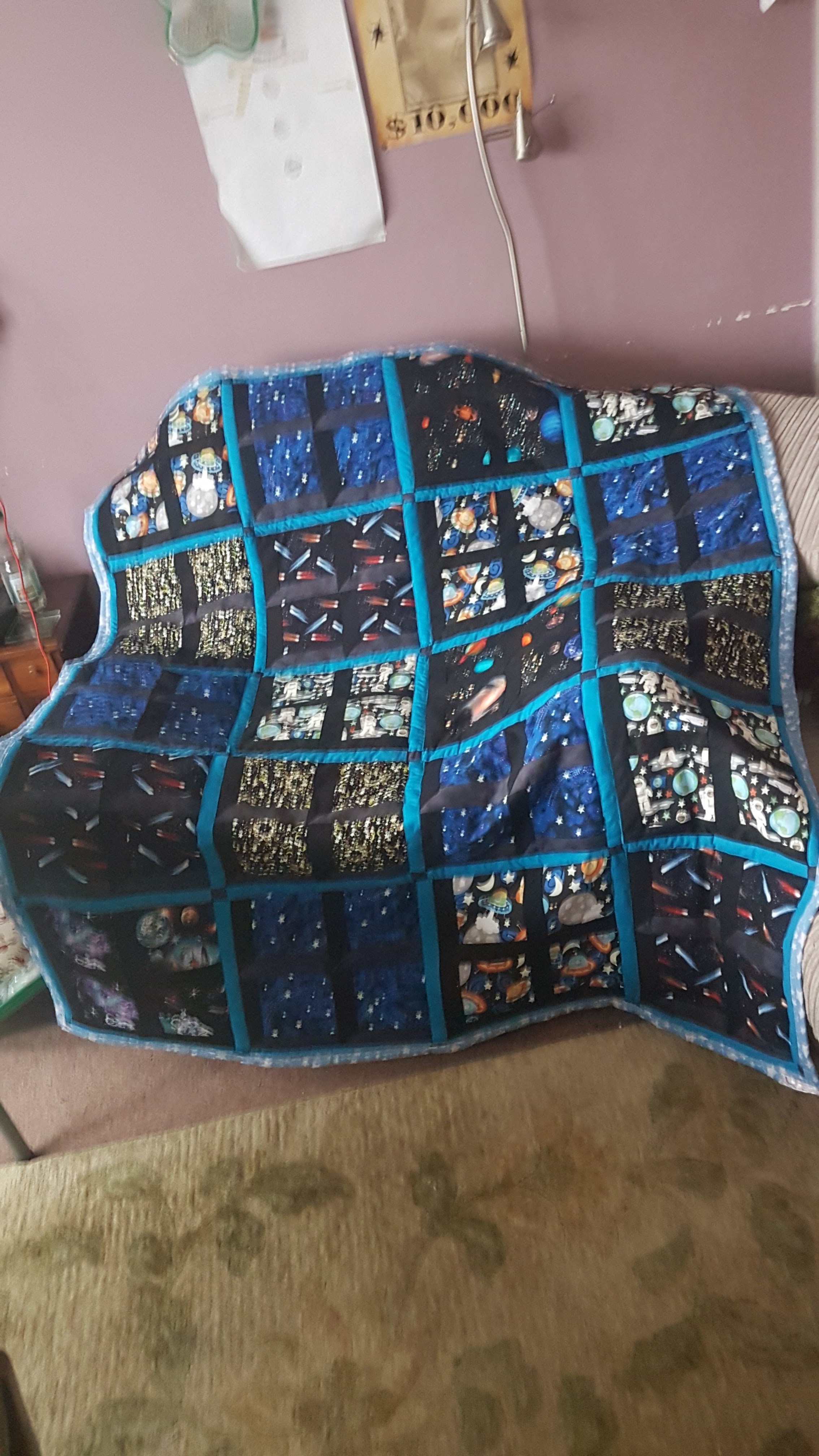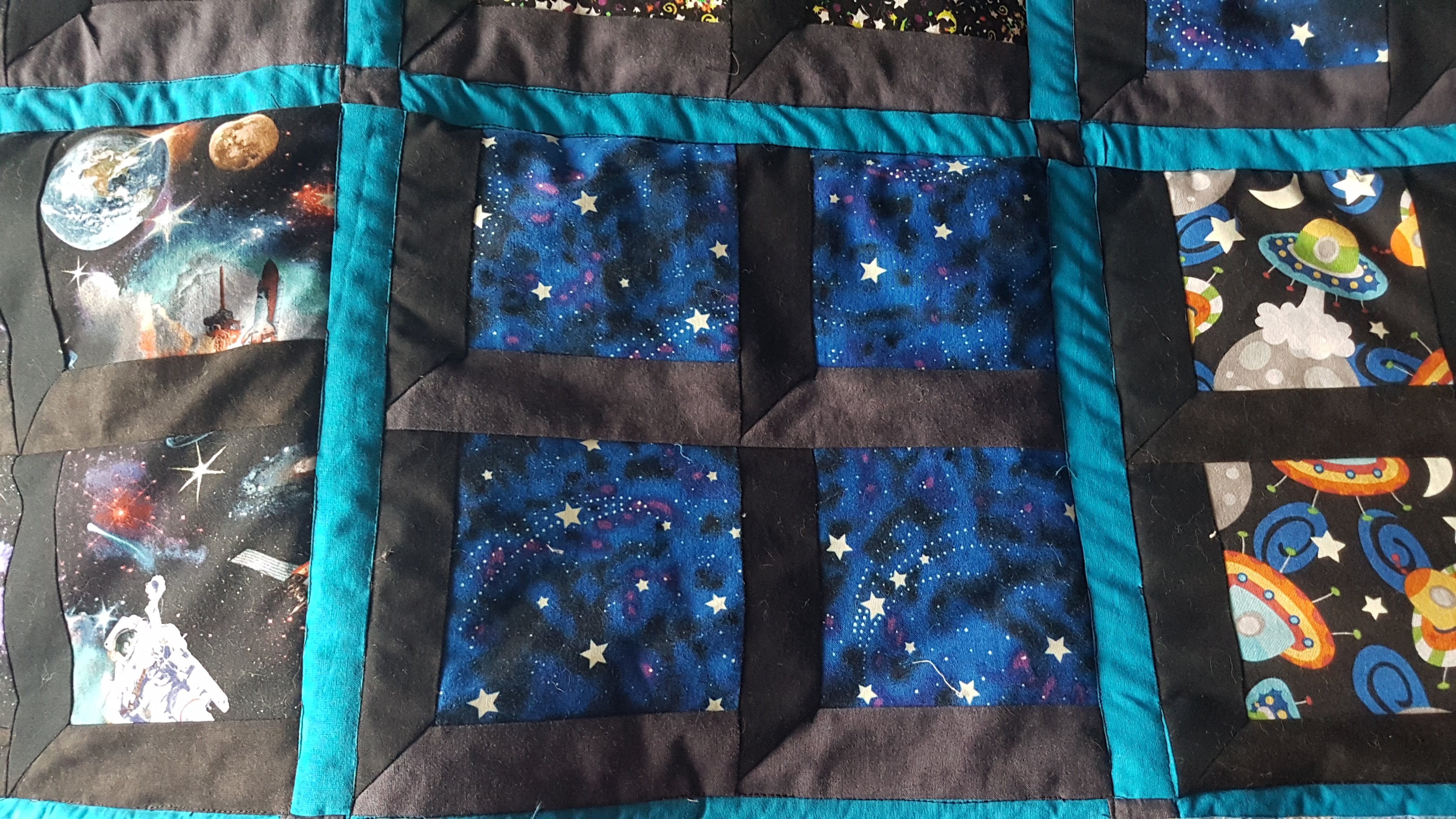 And then I found a package of fabric in the stash with a space theme – astronauts, planets, galaxies, flying saucers – and some black/marbled black solid fabrics so at some point I must have been thinking of an Attic Window quilt. That made the decision pretty easy, but I have been playing with the blocks again and can’t decide on a random scatter of prints or to make blocks of four together. I quite like the random scatter but also the idea of blocks of four smaller ‘windows’ with sashing between them.