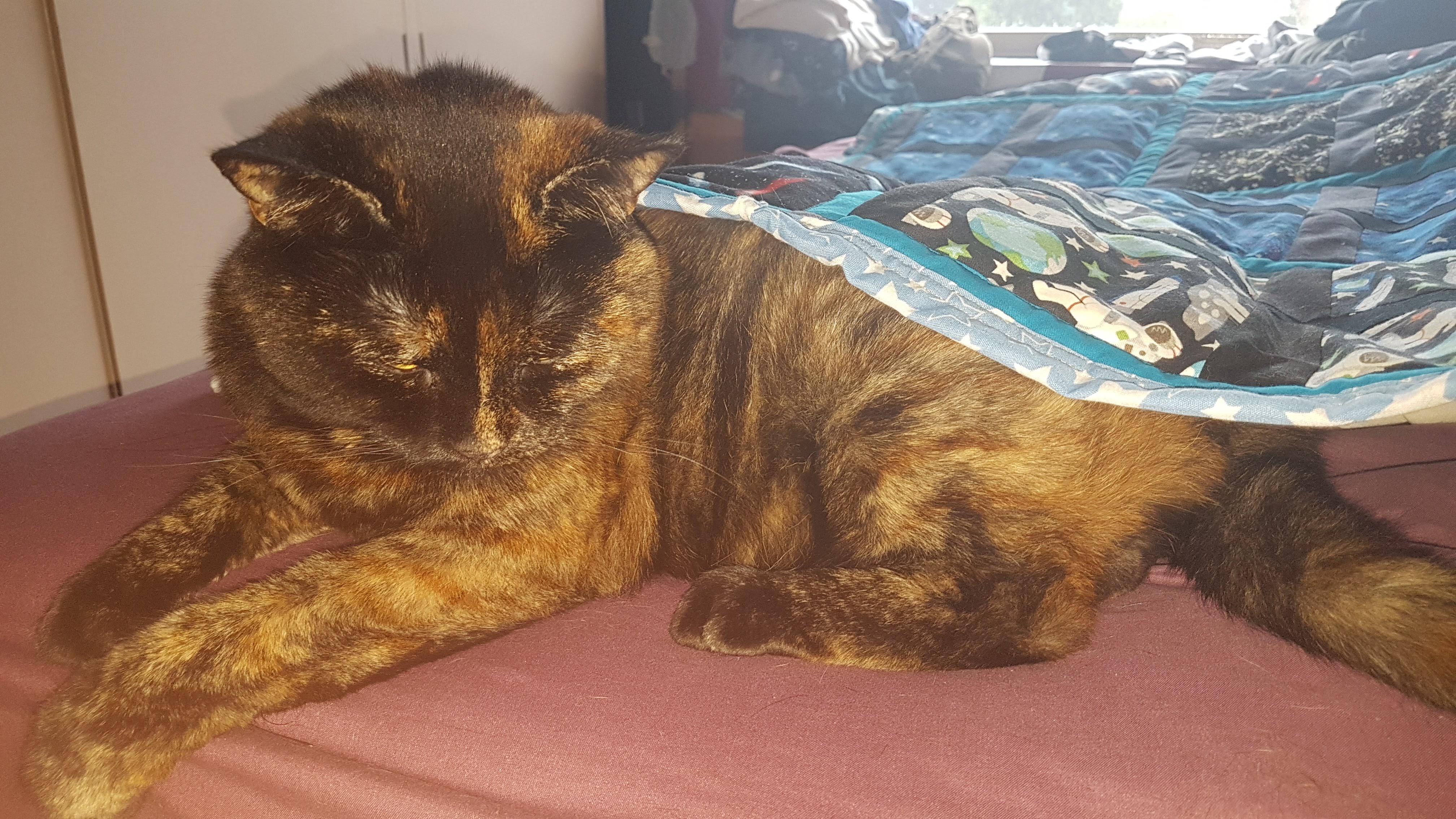 I finished the Disappearing Nine-Patch quilt too, although I forgot to make a border and just ended up using the backing fabric to bind it. It was hard to manipulate that much fabric so I didn’t do much quilting on it – but even with that managed to get a giant tuck on the back. It’s ended up about 5 feet long and about 4 and a 1/2 feet wide, so it’s definitely the biggest thing I have ever made. Here it is in all its glory – as you can see, Lulu was not keen to move when I was trying to take photos of the quilt on the bed. As soon as I put the camera away she came to inspect my handiwork, of course. Cats. Cats are nice.