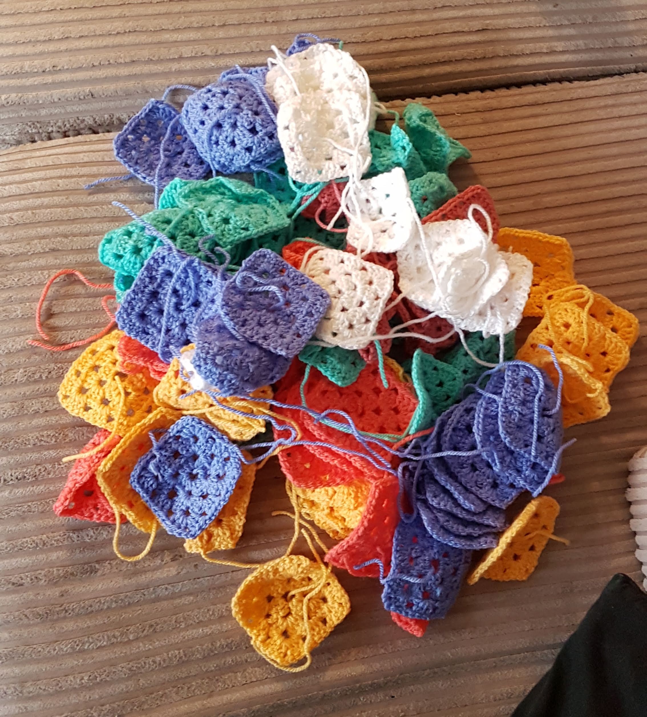 I’ve also been adding to my portable crochet project – the one I do on tubes, in queues and during zoom conferences when I need to focus. If my hands aren’t busy I find things to fidget with and get very distracted, but a granny square in hand keeps my eyes on the screen. I am making small squares this time, using leftover DK yarn from the stash – when it comes to sewing the ends in I will undoubtedly regret it. This will be a blanket, I think: I am going for a patchwork effect.