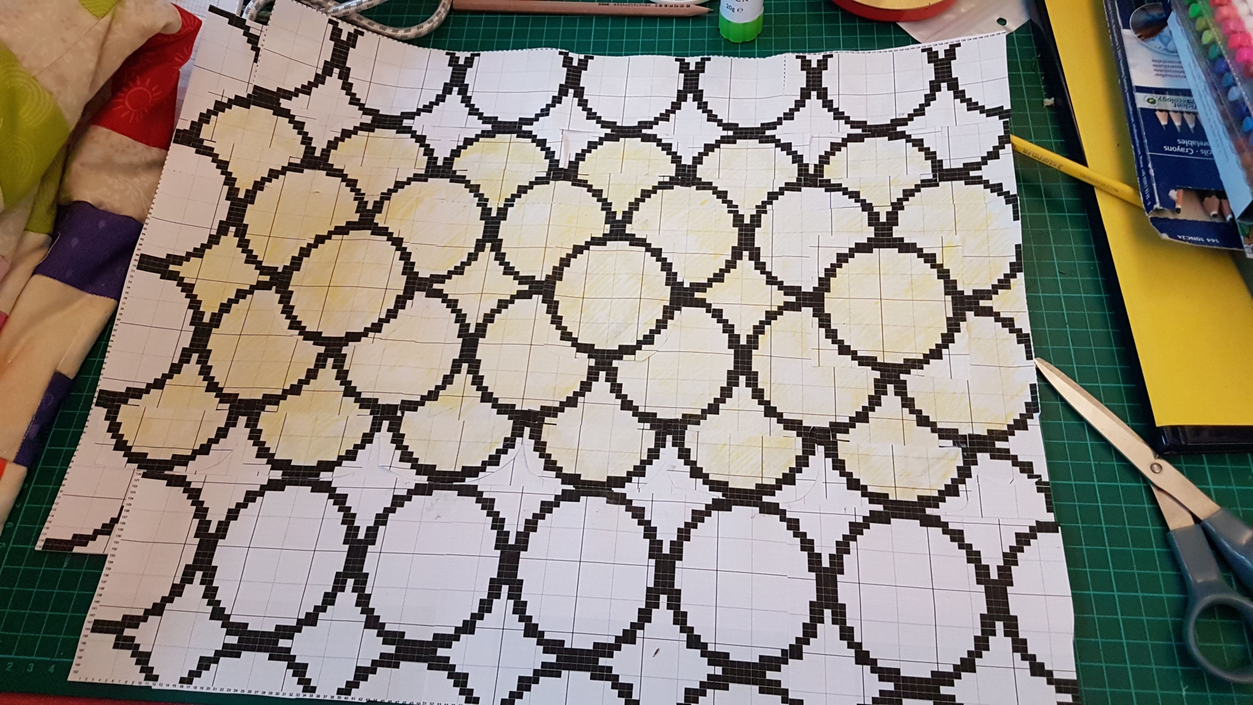 Then it got a bit tricky – I could not see where to start the overlay to create the fish scale pattern on the screen, so I went back to basics: I printed the pattern twice, stuck one together as the base layer and then cut circles out of that so I could layer them up with the handy glue stick and the coloured pencil so I could mark where I was up to.