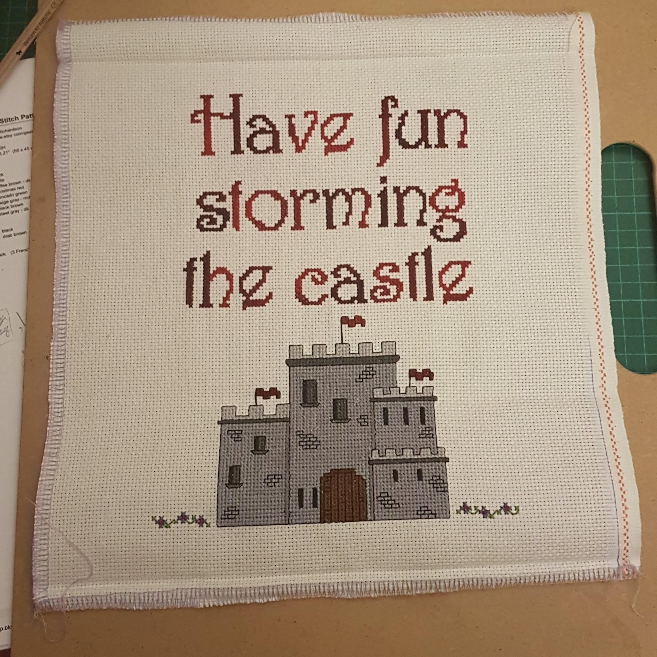 I finished the ‘Storming the Castle’ piece as well, which I am pleased with. I need to iron it, and then decide on finishing – wall hanging or frame? Note the overlocked edges on the fabric too – I’ve never thought of doing that to prevent fraying before but will definitely be doing it every time now!