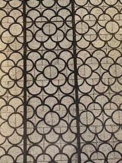 I started with my trusty grid paper from StitchPoint, trying to turn the uneven blocks you can see in the image into a uniform pattern. The blocks were all made individually by women prisoners from Woking Gaol, and some are more even than others, so this was quite tricky to do. I wanted to create a repeating pattern, rather than an exact replica of the floor itself, and I found it hard to translate the tiles onto my graph paper.