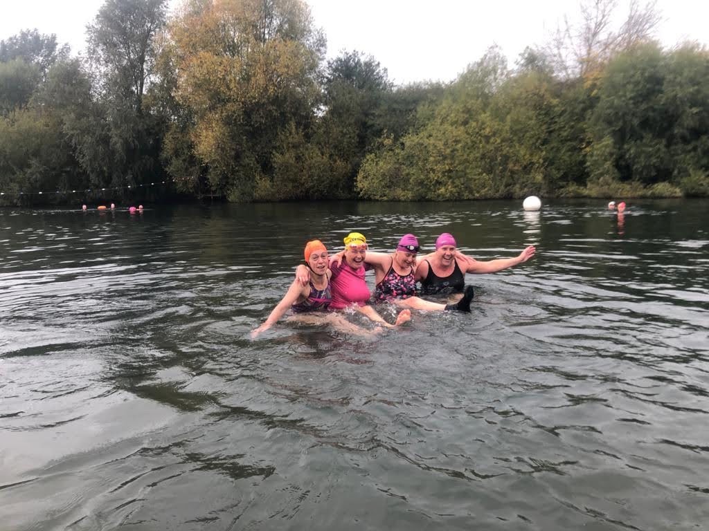 I’m still swimming in a wetsuit, though only 3mm, and I have added neoprene socks and gloves to the kit which make a difference. You wouldn’t think they would, since the cold water is inside them, but there we are. The last thing I do before racing for the towels and hot chocolate is strip the wetsuit off and jump back in the water in ‘skins’ for a splash about which is quite exhilarating. You really do earn the hot chocolate. Here we are this morning – I’m a great believer in the icy plunge, but the other three don’t usually do it and claim that I’m mad.